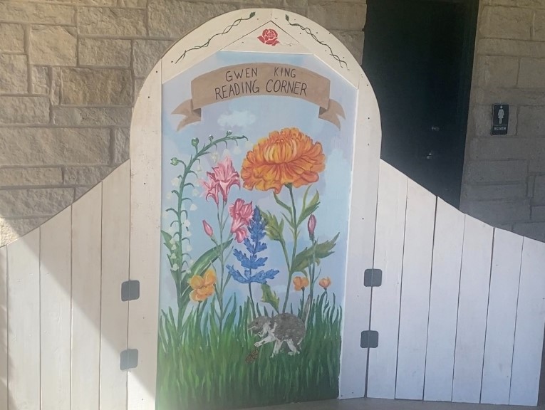 Once Ortega finished construction, Programs Assistant Claire Fleming painted the mural on the backdrop: several colorful flowers amid a soft, blue sky with a banner that says “Gwen King Reading Corner.”