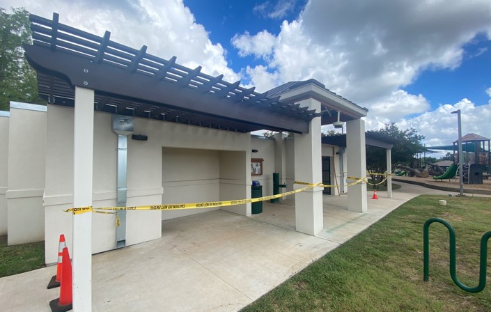 The bathroom facilities abutting the field pavilion on the east end of Cat Hollow Park remain open for park patrons.